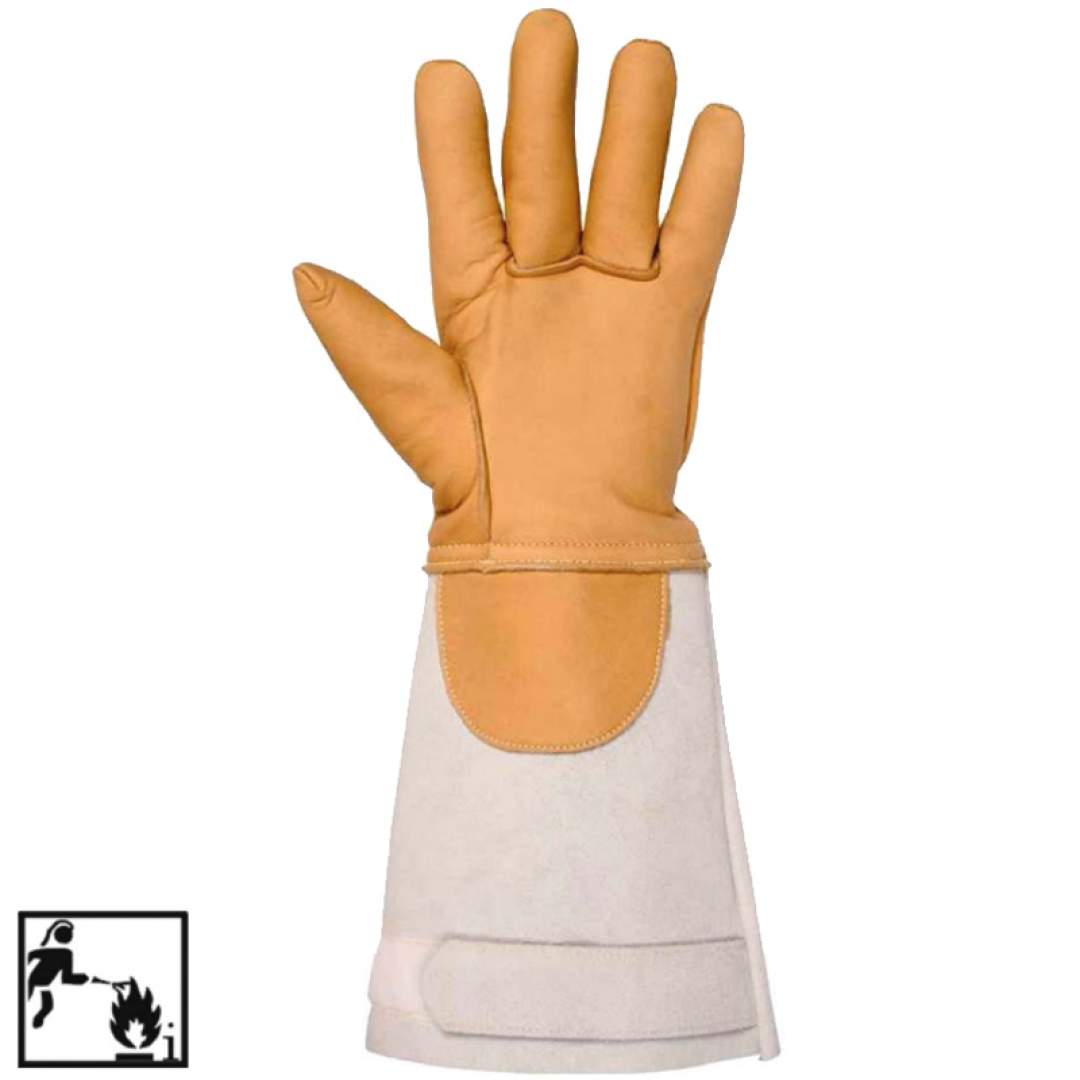 Descriere: mănuși cu 5 degete din piele bovina cu manseta lunga de 15 cm din spalt, captusite cu tricot Kevlar, cu protectie arteriala și element de ajustare cu banda velcro, cusaturi cu ata Kevlar.