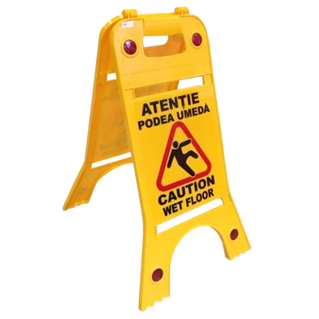 Indicator Atentie Podea Umeda, din plastic, imprimat pe ambele fete in limba romana si limba englezaSe utilizeaza in timpul si dupa spalarea pardoselilor pentru atentionarea trecatorilor asupra riscului de alunecare.