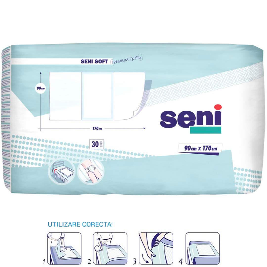 Aleze igienice (protectii pat) premium, folie impermeabila partea inferioara - Seni Soft 90x170 (30 bucati)