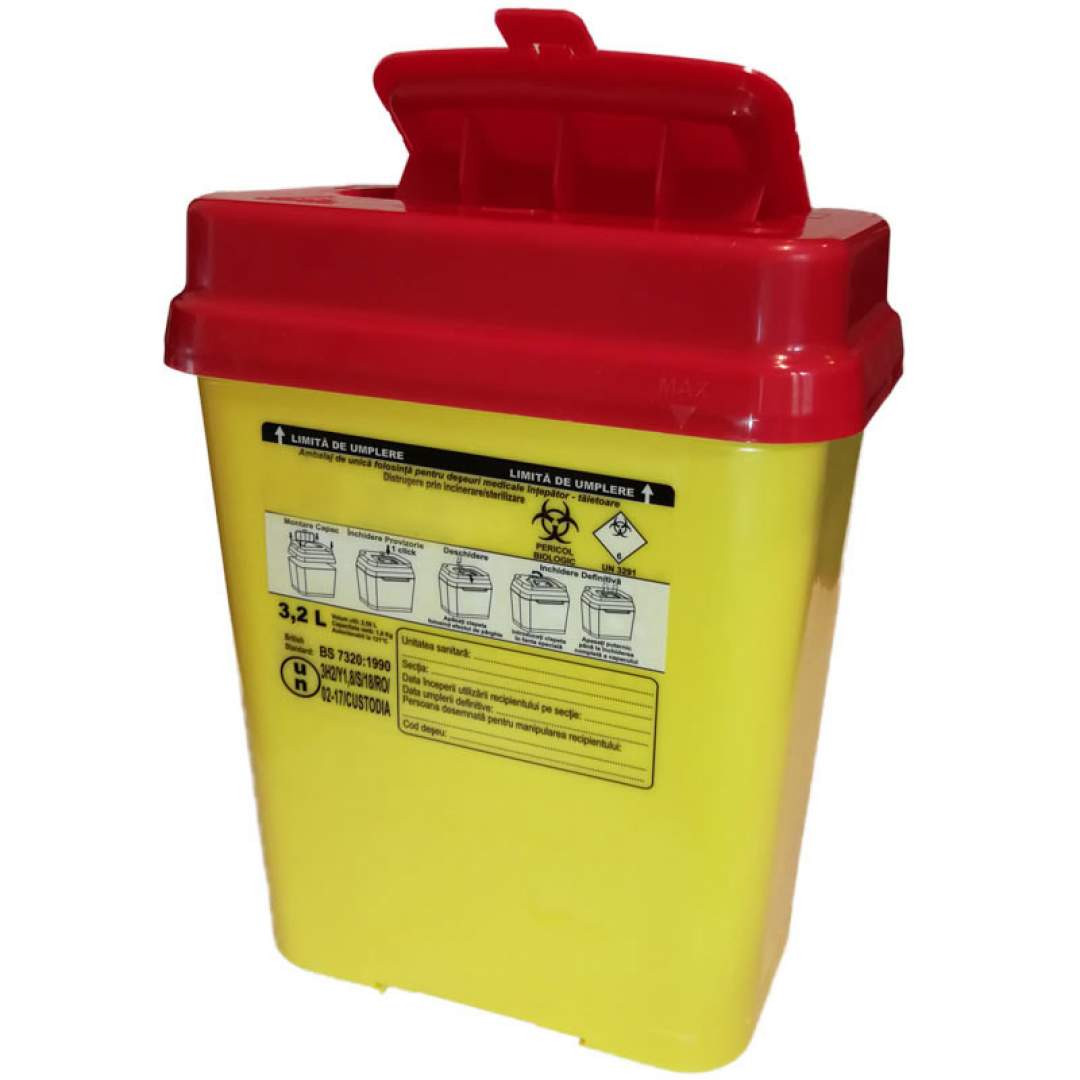 Recipientul sau containerul pentru deseuri medicale cu pericol biologic este utilizat pentru colectarea deseurilor taioase si/sau intepatoare (bisturie, lamele microscop, seringi si ace, branule, etc.