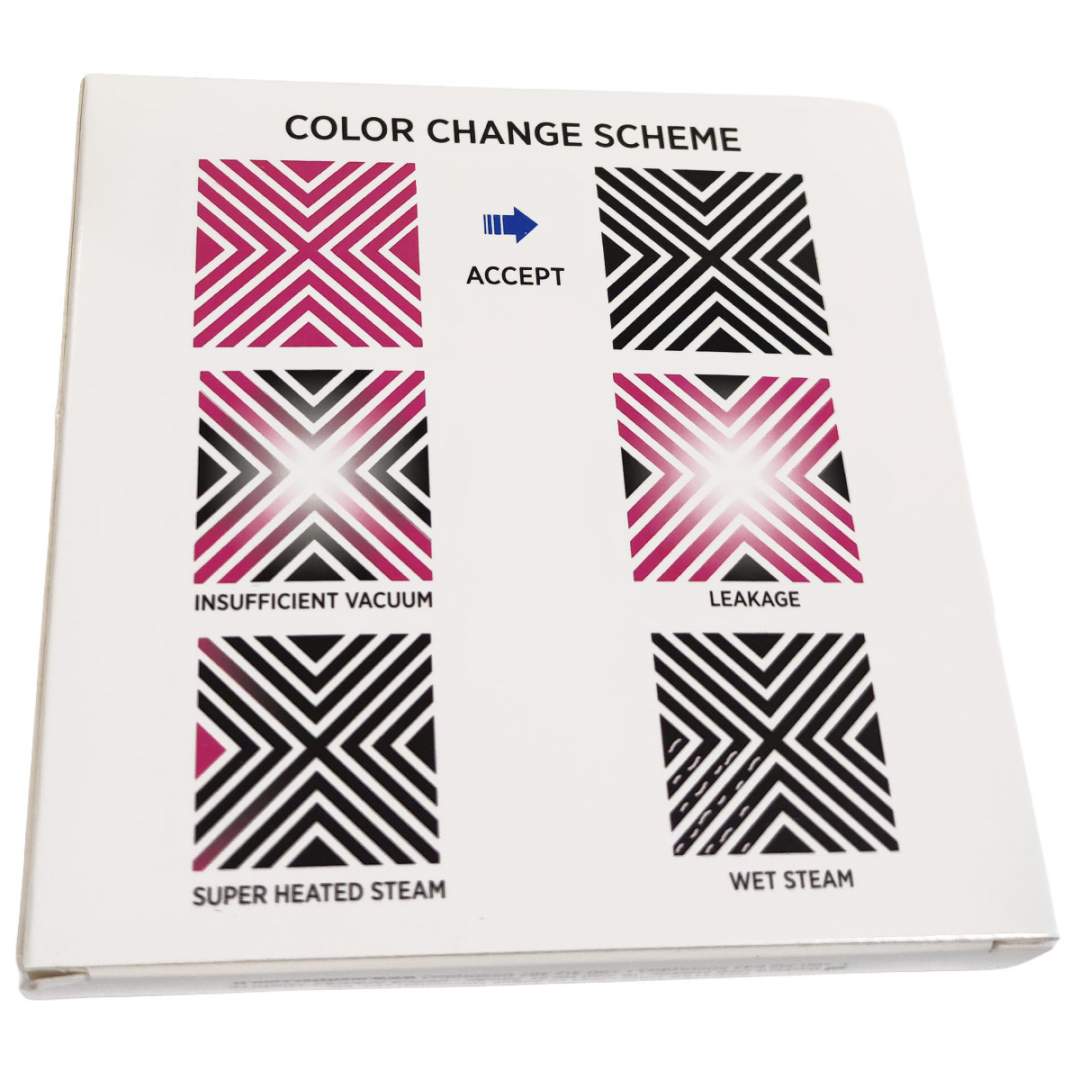 Hârtie albă de umplere 95 × 125 mm, 1 test indicator imprimat în interiorul pachetului, 1 foaie cu indicator de control, iar cartonul indicator este acoperit cu film protector.