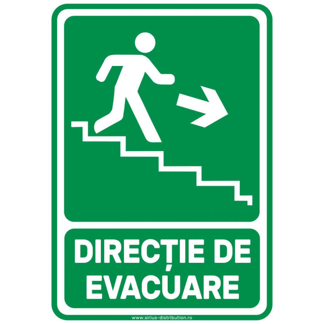 Autocolant de semnalizare pentru indicarea zonelor prin care se face evacuarea persoanelor/bunurilor. Acest autocolant este realizat din folie PVC, autoadeziva cu o grosime de 75 de microni. Se aplica pe suprafete plane, curate și uscate in locuri bine iluminate, vizibile și usor accesibile. Dimensiuni: 148mm x 210mmLivrarea produselor