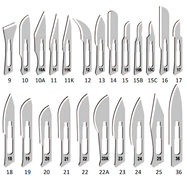 Lamele de bisturiu au diferite forme, forma este înregistrată sub forma unui număr (de 9 la 36)