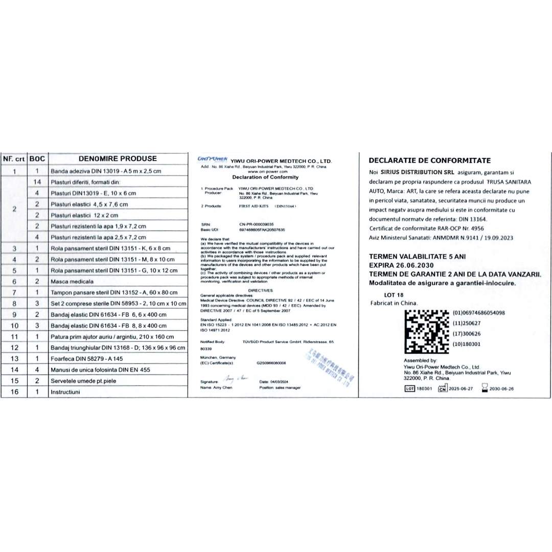 Trusa sanitară auto de prim ajutor, avizată RAR și Ministerul Sănătății, conform standardului european DIN 13164.